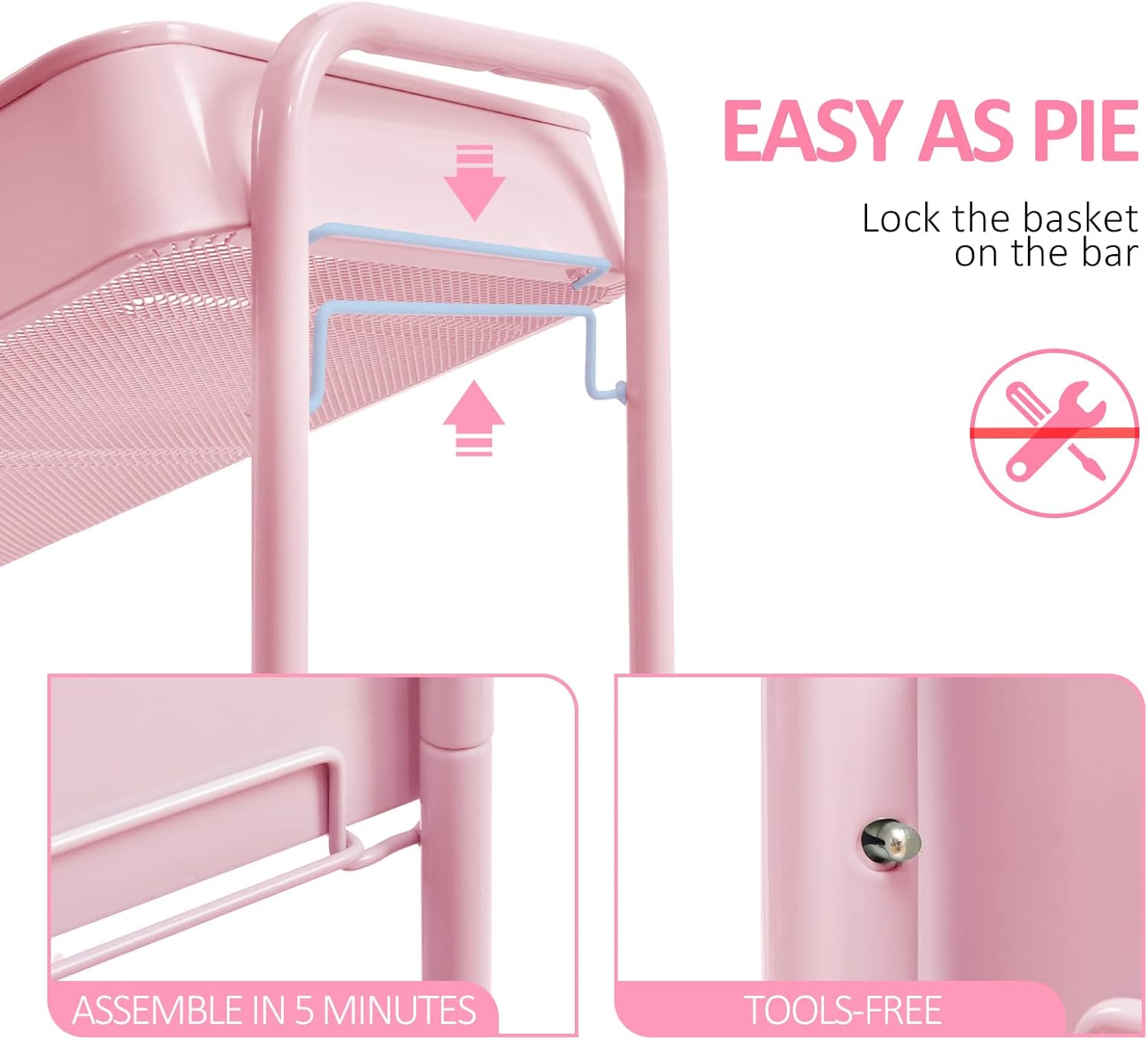 - 【Easy Assembly & Sturdy Built】This Toolf rolling cart in pink is easy to assemble. The cart doesn't require any screw and take only minutes to install. The heavy-duty metal frame and rust-resistant coating makes it even more durable. The bathroom cart can hold up to total 132lbs.