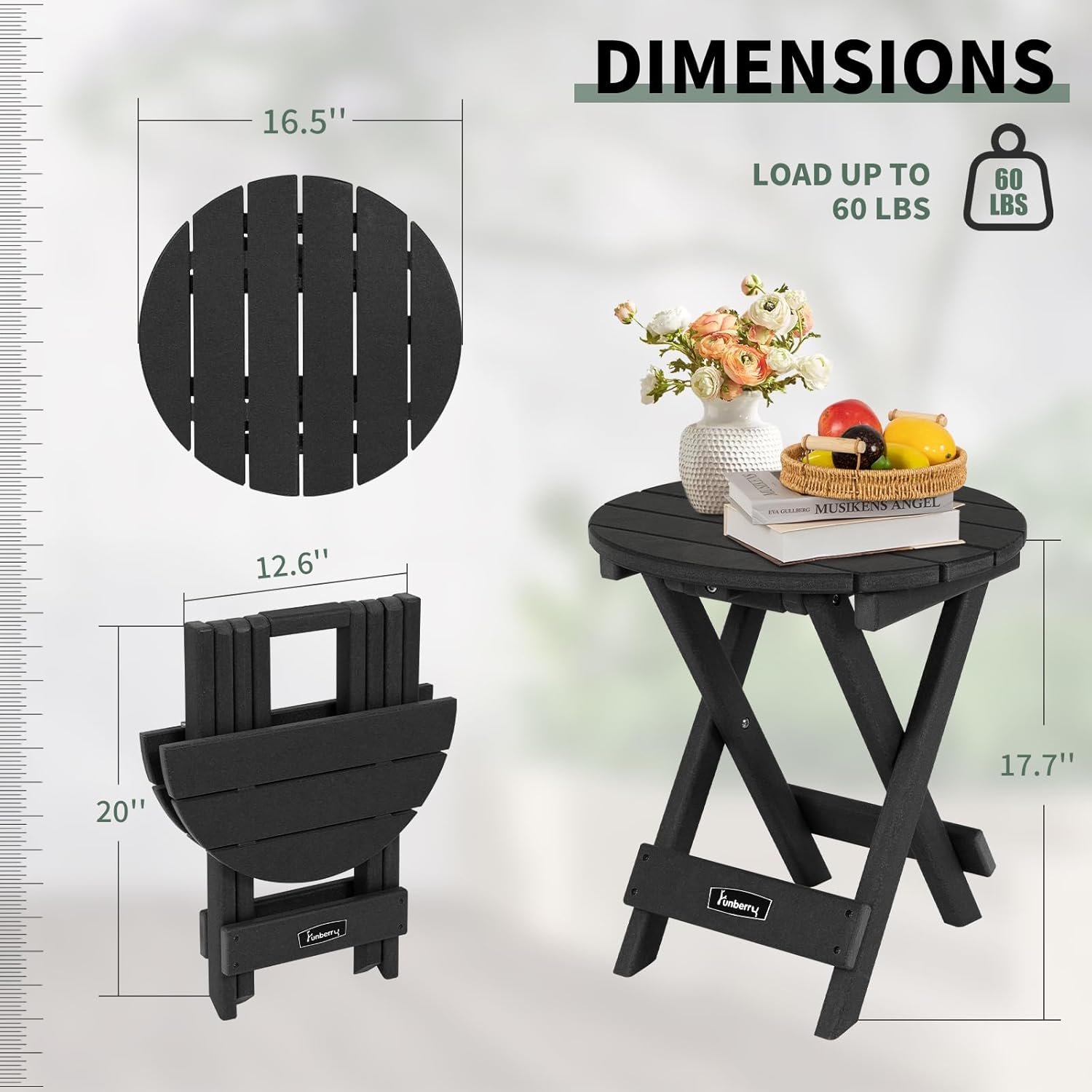 - Portable Folding Side Table: This patio side table is portable, with a quick fold-away design, you can easily carry it with you when fold it up. When unfolded, the diameter of the table top is 16.5'', and it's 17.7'' tall. This side table can hold up to 60 LBS. This patio end table is an ideal companion for Adirondack chairs, rocking chairs and chaise lounge chairs.