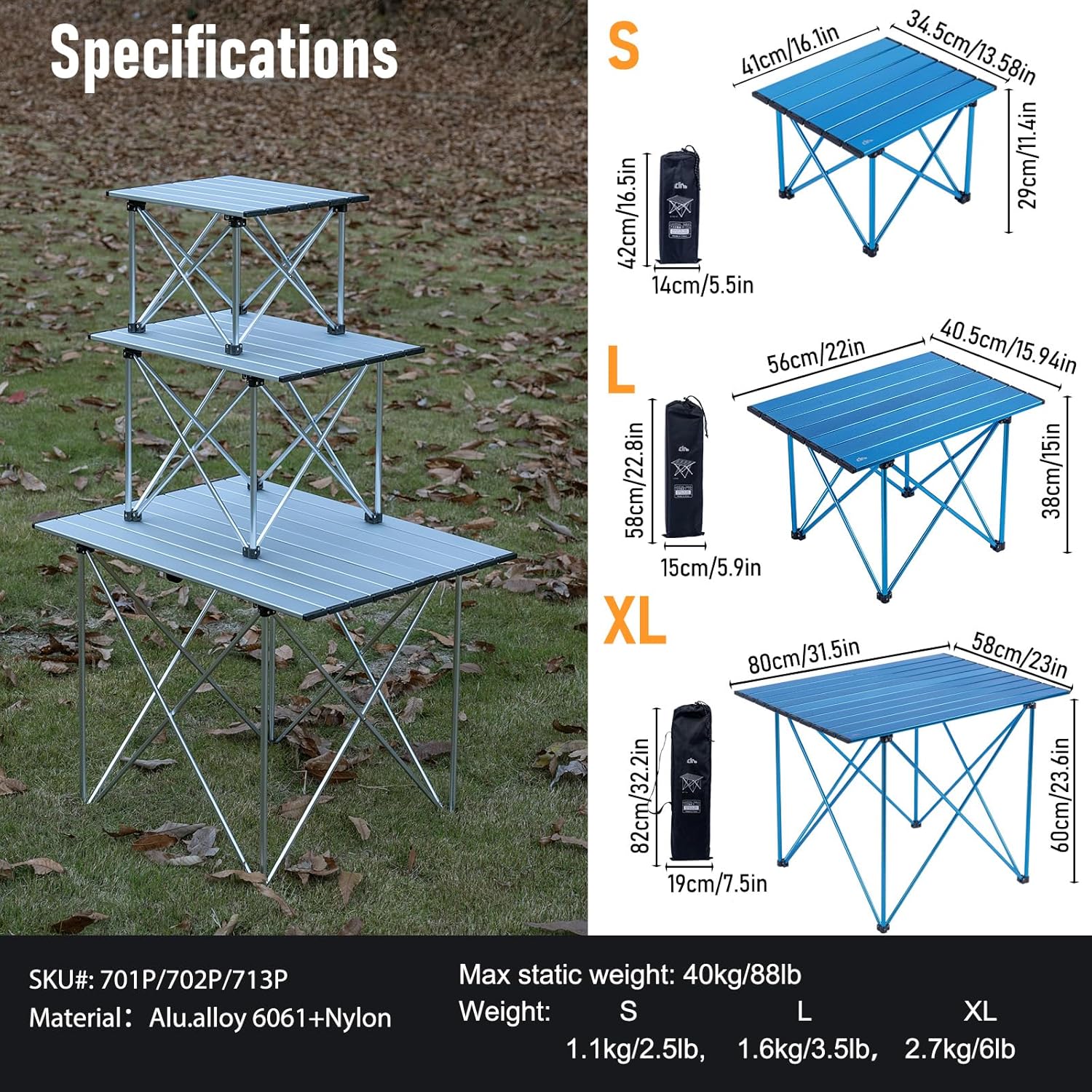- Ultralight, made of aerospace-grade aluminum alloy, only 2.5 lbs; Max Load 88 lbs; Unlike wooden or nylon-top tables, this table is durable, waterproof, corrosion-resistant, easy to clean; Sturdy joints and anti-slip feet keep the table stable, with legs that won’t fold, bend, or slip on any terrain; Very easy to set up, just open the base frame and attach the tabletop, enjoy your leisure time in seconds, video guide available on this page.